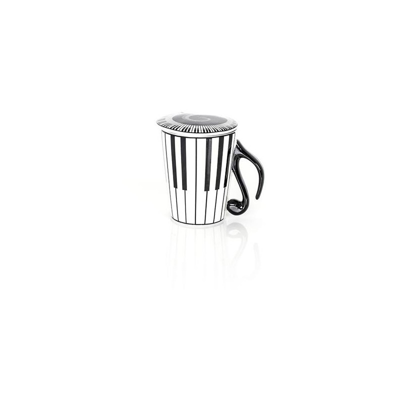 Cet élégant ensemble de tasse et couvercle en porcelaine est décoré de portées de musique verticales et de notes sur la tasse et d'un clavier en spirale sur le couvercle. Cette tasse va au micro-ondes.