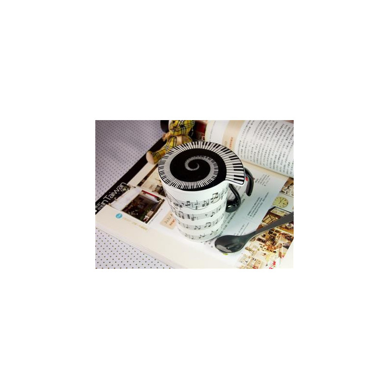 Cet élégant ensemble de tasse et couvercle en porcelaine est décoré de portées de musique verticales et de notes sur la tasse et d'un clavier en spirale sur le couvercle. Cette tasse va au micro-ondes.