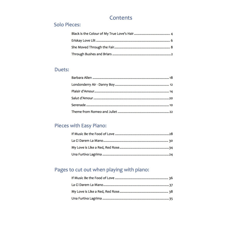 Les pièces incluent : The Londonderry Air, The Force of Destiny Verdi, Little Brown Jug, God Rest Ye Merry Gentlemen, Miss Lucy Long, Greensleeves, Lord of the Dance, Good King Wenceslas, La Cucuracha, Scarborough Fair, The Holly and the Ivy , Chanson des pêcheurs de perles - Bizet, Sussex Carol, Skye Boat Song My Bonnie Lies over the Ocean et bien d'autres.