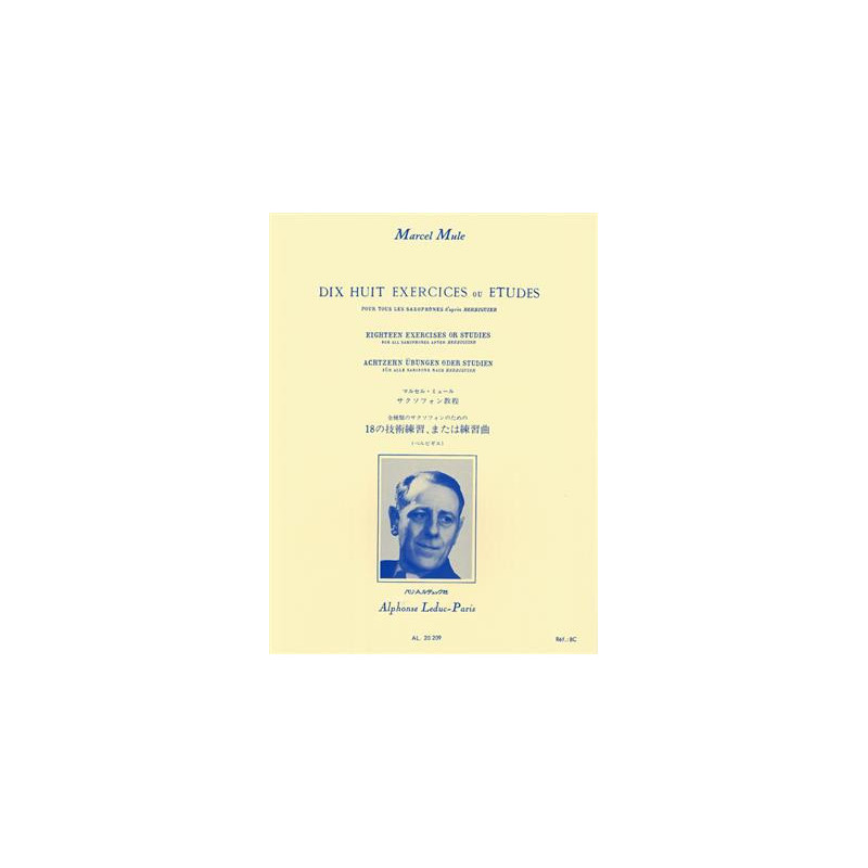 Dix-huit exercices ou études de Marcel Mule (1901-2001), révisés et arrangés pour saxophone, d'après 18 études pour flûte de Benoit Berbiguier (1782-1835). Conçue pour des élèves intermédiaires, cette méthode doit permettre aux musiciens de développer la musicalité tout en conservant la même qualité tout au long de la pièce, si les indications sont bien suivies. Marcel Mule (1901-2001) est l'un des plus grands saxophonistes français, mondialement reconnu pour son travail sur le répertoire classique du saxophone. Il enseignait à ses élèves comment obtenir une bonne qualité sonore et croyait que cela dépendait de l'embouchure, de l'émission, de la maîtrise du vibrato et donc de la respiration. Il a écrit différentes méthodes qui se concentrent sur la technique, l'articulation et les productions sonores telles que 'Scale and Arpeggios' (en trois livres), 'Exercices Journaliers d'après Terschack' ou ' 30 Grands Exercices ou Études d'après Soussmann' (en deux livres), entre autres. Benoit Berbiguier (1782-1835) est un flûtiste et compositeur français. Il a écrit quelques méthodes, duos et exercices pour flûte.
