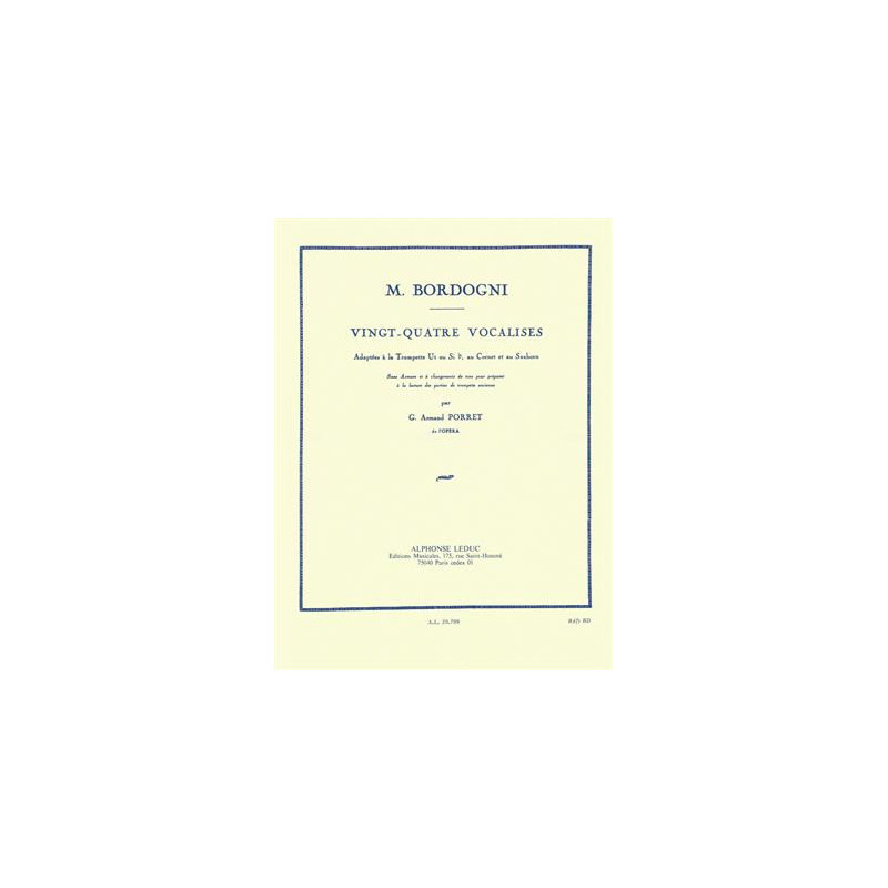 Ténor d'opéra italien, Marco Bordogni (1789-1856) a reçu un grand succès en tant que chanteur et professeur lorsqu'il a déménagé à Paris. Ses Vingt-Quatre Vocalises sont restées populaires, à tel point que G. Armand Porret a vu la nécessité d'adapter les études aux cuivres. Dans la disposition de Porret, qui est ajustable en C ou B? Trompette, Cornet et Saxhorn, une table de transposition pratique est incluse. Les Vingt-Quatre Vocalises permettent à l'interprète de se concentrer sur le ton, le lyrisme, l'articulation, le contraste dynamique, le doigté et le contrôle de la respiration, entre autres aspects significatifs. Étant particulièrement polyvalent, et étant resté une aide appréciée des chanteurs et instrumentistes pendant plus de deux siècles, il est clair que Vingt-Quatre Vocalises, adapté pour C ou B Trumpet, Cornet et Saxhorn seraient une aide cruciale à la progression d'un interprète.