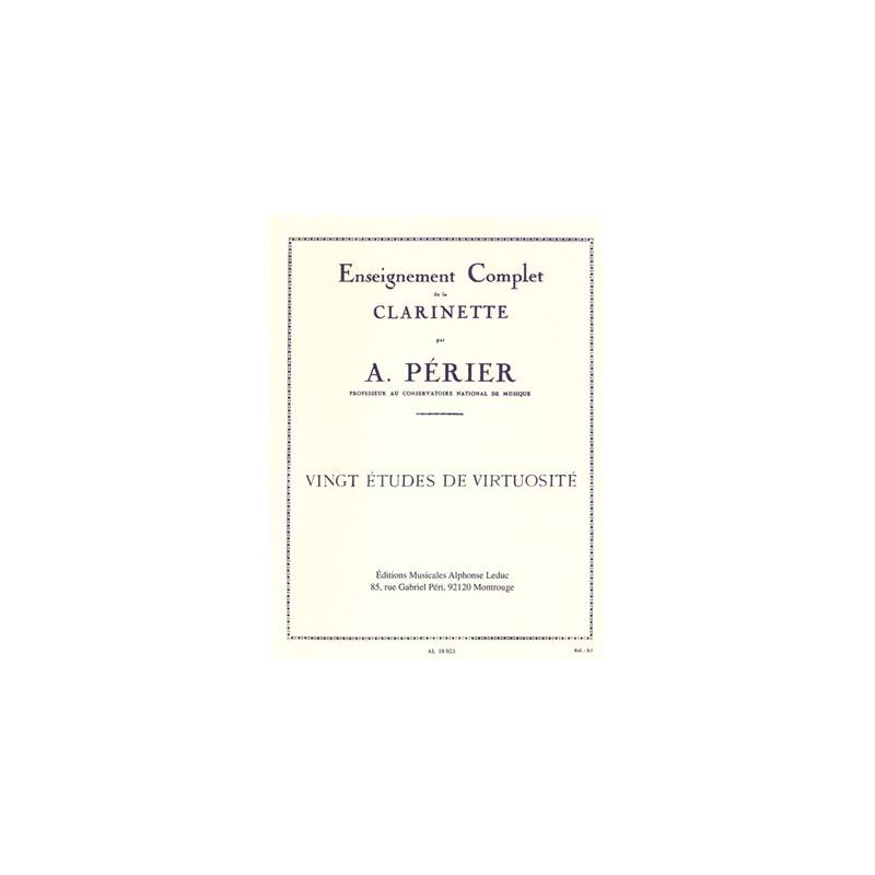 Né dans le sud de la France, Auguste Périer (1883-1947) étudie à l'Ecole Nationale de Musique de Montpellier avant d'entrer au Conservatoire de Paris. Pendant ses études, il remporte le premier prix de clarinette en 1904, ce qui prouve sa grande maîtrise de l'instrument. Par conséquent, son étude complète de la clarinette est très bien informée. Le huitième volume de la série, 20 Virtuosic Studies, convient aux clarinettistes des grades sept et huit standard. Il aborde des fonctionnalités telles que l'articulation, la dynamique, les gammes, les arpèges, les altérations, l'ornementation, les directions de performance, les marques de tempo, le phrasé, les signatures de clé et de temps, et les rythmes complexes, entre autres aspects. L'étude complète de la clarinette de Périer (20 études virtuoses) est essentielle pour les clarinettistes avancés qui cherchent à améliorer leur technique à un niveau élevé.