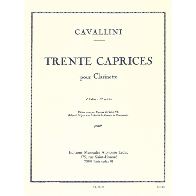 Clarinettiste et compositeur italien, Ernesto Cavallini (1807-1874) a étudié au Conservatoire de Milan. Surnommé le « Paganini de la clarinette », il n'est pas surprenant que ses études pour cet instrument, telles que les 30 Caprices, soient très documentées. Le volume 2 des 30 Caprices de Cavallini contient les caprices 19 à 30. Toutes ces études, virtuoses, abordent des aspects tels que le chromatisme, les gammes, l'articulation, la vaste tessiture, le contrôle du souffle, les intervalles, les variations dans les directions d'interprétation, la dynamique et le tempo, les différentes armures et signatures rythmiques, les rythmes complexes et l'ornementation, entre autres. Pour tous les clarinettistes avancés, les 30 Caprices de Cavallini sont essentiels et garantissent une progression technique de haut niveau.