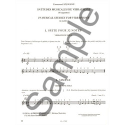 Alors qu'il existe peu de livres d'étude sur le Vibraphone, Emmanuel Séjourné assure que cette lacune est comblée avec ses excellentes 19 Etudes Musicales pour Vibraphone. Le cinquième volume contient 19 petites pièces de difficulté croissante. Chaque pièce est dans un style différent, du jazz, du swing, du funk et du blues à la musique contemporaine, néoclassique et imitations de compositeurs tels qu'Erik Satie et JS Bach. De plus, chaque courte pièce aborde un problème technique différent. Toutes ces caractéristiques des 19 études musicales de Séjourné combinées en font un excellent livre d'étude pour les joueurs de vibraphone.