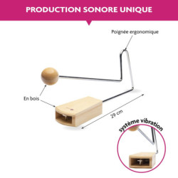Grâce à sa poignée ergonomique, cette cloche en métal offre une prise en main facile et immédiate. Pour la faire résonner, utilisez la mailloche pour frapper l'instrument sur sa surface intérieure, ou extérieure. Idéal pour l'éveil musical.
