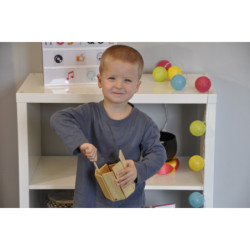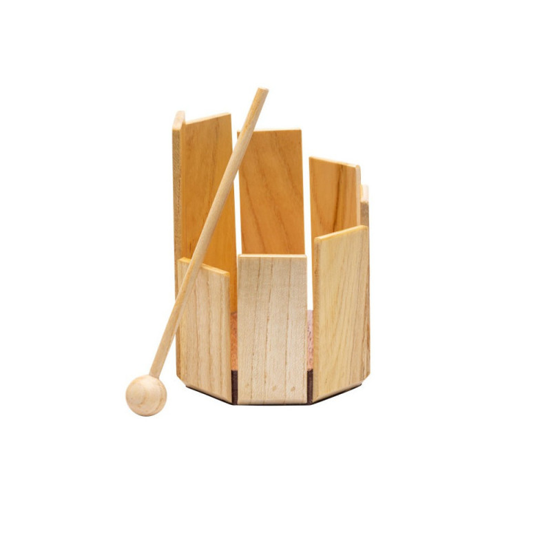 * ASTUCE SONORE : Une autre idée à exploiter : en remplaçant la mailloche par une bille de bois, il suffit de la faire rouler à lintérieur de linstrument pour obtenir ce son unique.