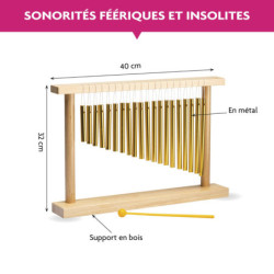 Cylindres en métal de différentes longueurs montés sur un support bois, les chimes de table créent un effet sonore spécifique lorsqu'ils s'entrechoquent. Instrument mélodique et mélodieux, il est autant plébiscité par les musiciens professionnels que par les mélomanes avertis.