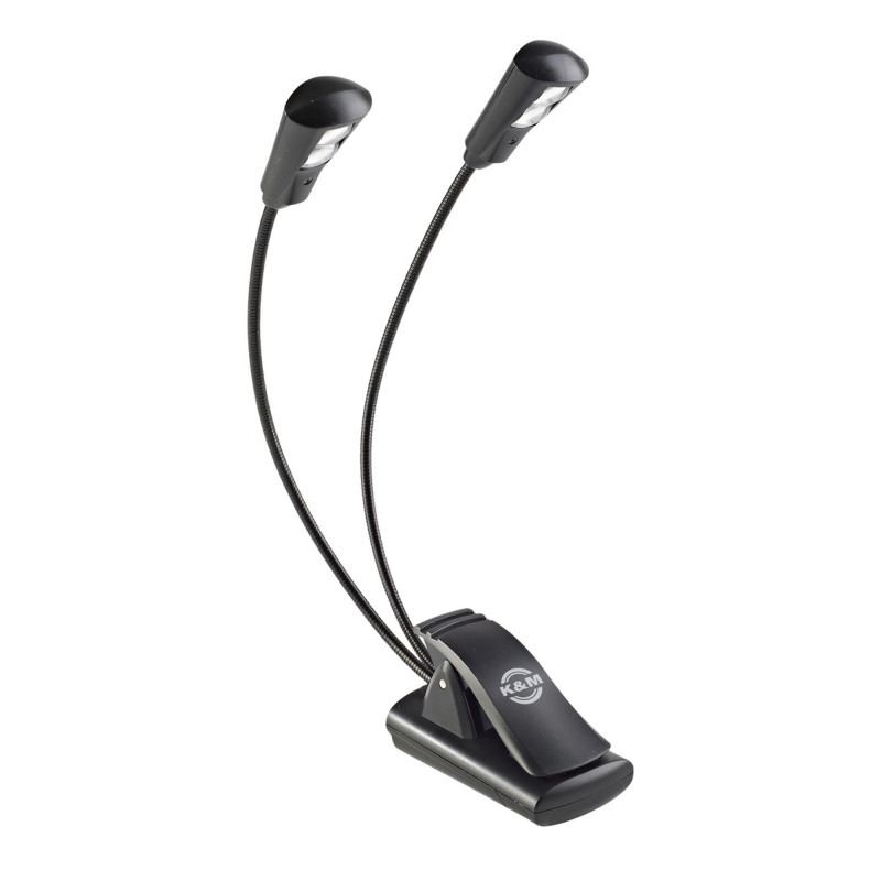 Lampe de pupitre à pince, modèle FlexLight, 2 bras flexibles en col de cygne équipés de 2 LED chacun, luminosité douce et agréable (intensité d'environ 2 x 1300 lux), pince pour fixation sur tous supports (jusqu'à 25 mm d'épaisseur), livrée avec 3 piles AAA (autonomie de 20 heures), poids: 0.15 kg, adaptateur secteur vendu séparément.