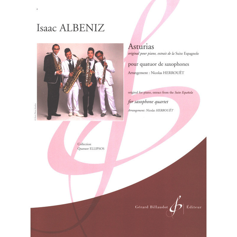 « Nicolas HERROUËT, baritoniste du Quatuor de Saxophones Ellipsos, propose une nouvelle version de la partition « Asturias », extrait de la Suite Espagnole dIsaac ALBENIZ pour piano à lorigine et rendue célèbre par la version guitare. Cest à titre posthume que léditeur intègre ce mouvement à la Suite dont chaque mouvement évoque le style dune région dEspagne. « Asturias » en devriendra alors lextrait le plus connu, avec ses notes piquées et répétées inspirées du flamenco andalous.