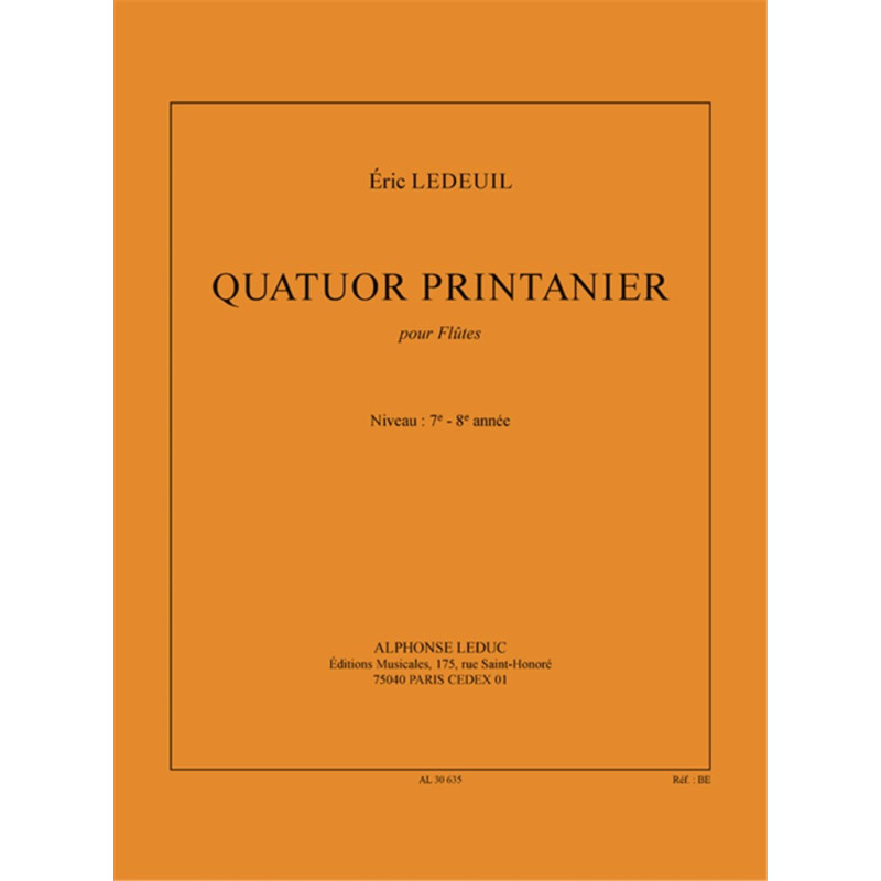 Né en 1970, Éric Ledeuil est un musicien polyvalent, uvrant comme flûtiste, compositeur, chef d'orchestre et pédagogue. Toute son expertise combinée a créé cette sublime uvre d'ensemble, Spring Quartet for Flute. Adapté aux flûtistes de niveau 7 et 8, Spring Quartet est composé de quatre sections; Floraison, Éveil des animaux, Envol et Apothéose printanière. Spring Quartet est un ajout passionnant et varié au répertoire du Flute Quartet, essentiel pour les flûtistes avancés qui cherchent à améliorer et à élargir leur expérience d'ensemble.