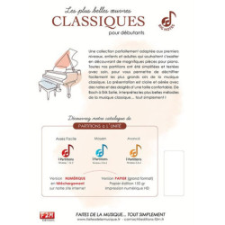 Une collection parfaitement adaptée aux premiers niveaux, enfants et adultes qui souhaitent sexalter en découvrant de magnifiques pièces pour piano. Toutes nos partitions ont été simplifiées et testées avec soin, pour vous permettre de déchiffrer facilement les plus grands airs de la musique classique. La présentation est claire et aérée avec des notes et des doigtés dune taille confortable. De Bach à Erik Satie, interprétez les plus belles mélodies de la musique classique tout simplement !