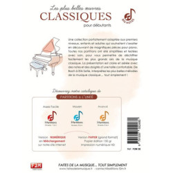Une collection parfaitement adaptée aux premiers niveaux, enfants et adultes qui souhaitent sexalter en découvrant de magnifiques pièces pour piano. Toutes nos partitions ont été simplifiées et testées avec soin, pour vous permettre de déchiffrer facilement les plus grands airs de la musique classique. La présentation est claire et aérée avec des notes et des doigtés dune taille confortable. De Bach à Erik Satie, interprétez les plus belles mélodies de la musique classique tout simplement !
