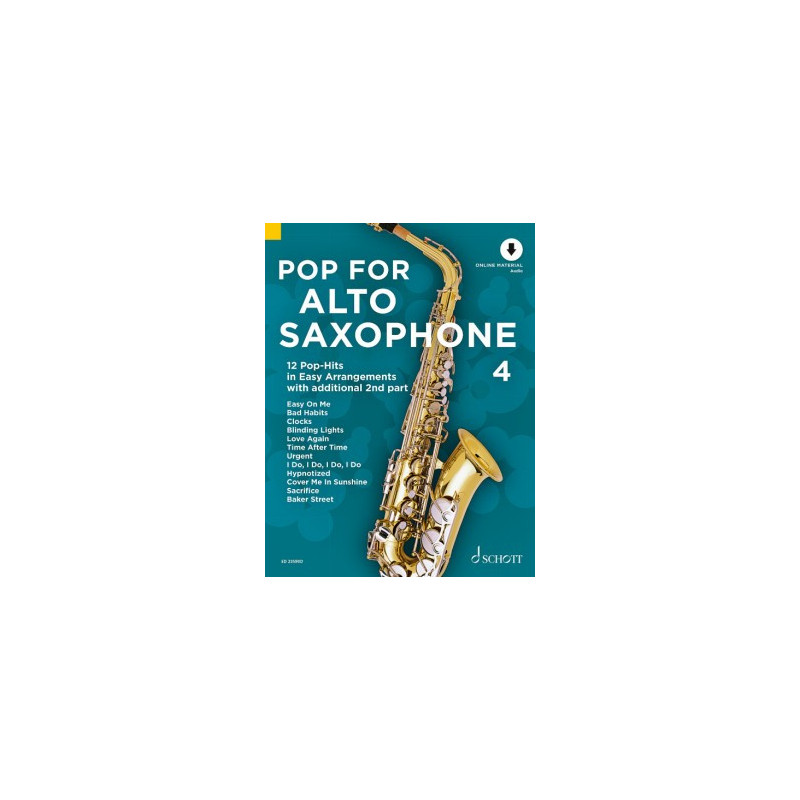 Les plus belles chansons pop, les bandes sonores les plus connues et les incontournables intemporels : Vol. 4 de la série Pop pour saxophone alto propose 12 arrangements simples pour 1 à 2 joueurs et des pistes d'accompagnement pour toutes les chansons. Les succès actuels des charts comme Easy On Me ou Blinding Lights côtoient les classiques de la pop Time After Time et Clocks . Les vrais moments forts du saxo incluent les chansons Urgent , Baker Street et un nouvel arrangement du classique d'Abba I Do, I Do, I Do, I Do .