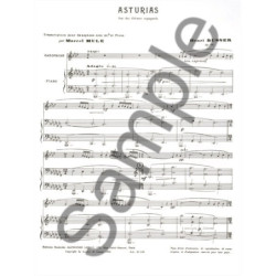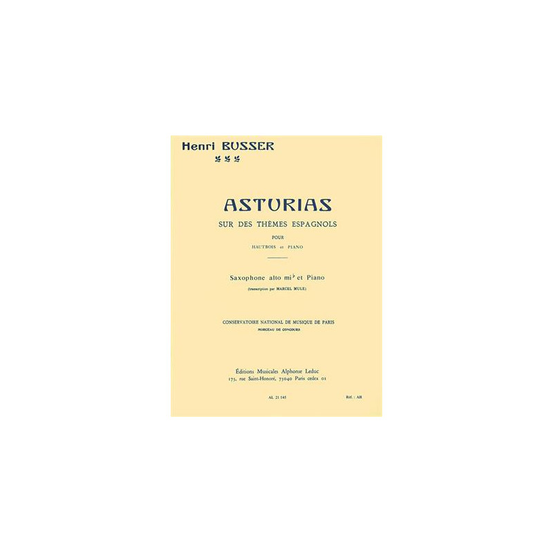 Cette édition des Asturies sur des airs espagnols, op. 84 d'Henri Busser est une version arrangée pour saxophone alto et piano en Mib. Editée par Marcel Mule, cette pièce peut être jouée par des joueurs avancés au regard de sa difficulté, la partition AltoSaxophone comporte 4 bémols et quelques altérations accidentelles. Il est divisé en six parties distinctes, dont un solo de saxophone en cadence. Henri Büsser (1873-1972) était un compositeur, organiste et chef d'orchestre classique français et Marcel Mule (1901-2001) était l'un des plus grands saxophonistes français, réputé dans le monde entier pour son travail sur le répertoire classique du saxophone.