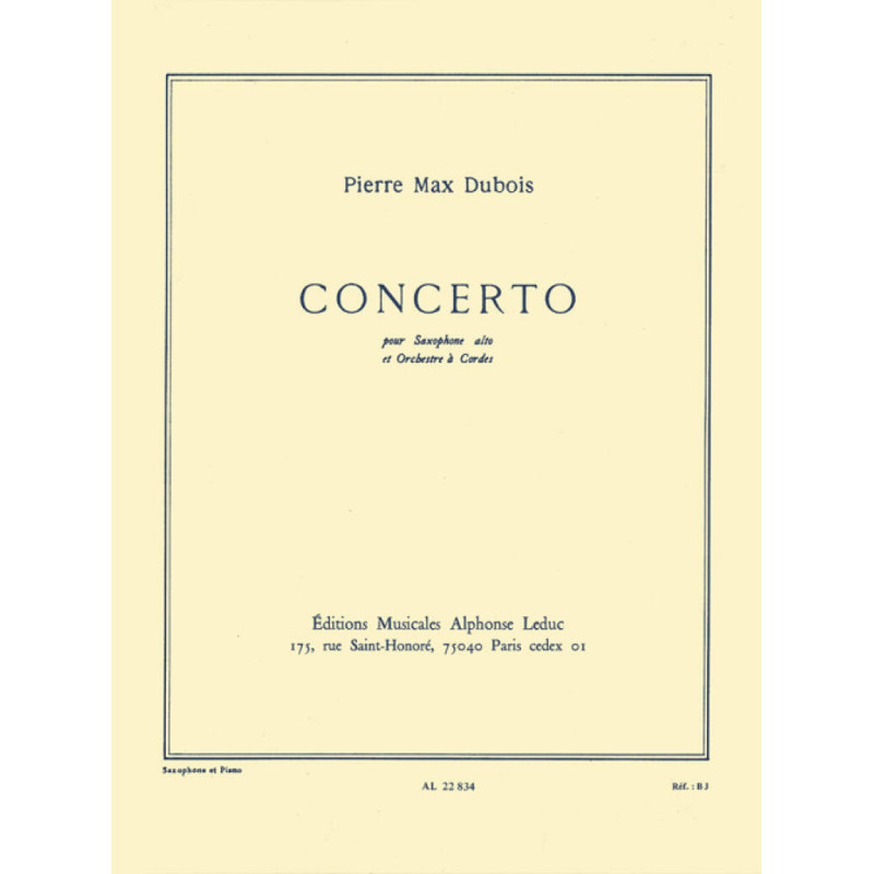 Le Concerto de Pierre Max Dubois est une pièce de 18 minutes initialement composée pour saxophone alto et orchestre à cordes. Cette édition est pour saxophone et piano. La partie de saxophone est considérée comme difficile et requiert une grande endurance et une bonne technique. Ce Concerto est divisé en trois mouvements distincts : 1. Lento, Cadenza et Allegro ; 2. Sarabande ; 3. Rondo. Très intéressant à jouer, c'est une pièce idéale pour les récitals et les concours. Pierre Max Dubois (1930-1995) est un compositeur français lauréat du Prix de Rome en 1955. Composant principalement de musique classique, ses uvres sont principalement pour bois. Il est l'un des fondateurs du groupe Les Six, dont son professeur, Darius Milhaud.