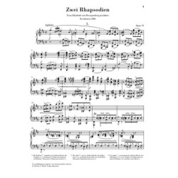 Les deux Rhapsodies op. 79, deux morceaux passionnés et denvergure, parurent environ dix ans avant que Brahms ne compose ses pièces pour piano tardives et mélancoliques. Cest par une de ses litotes habituelles quil annonce à une Clara Schumann convalescente deux pièces «avec lesquelles tu pourras te défouler et aussi vérifier si la cure ta été utile». Mais laissons plutôt la parole à Elisabeth von Herzogenberg, une autre amie de Brahms: «le morceau en sol mineur est mon préféré, mais je ne suis pas insensible à la beauté puissante et mordante du morceau en si mineur». Nous publions désormais une version révisée de ces deux pièces très populaires basée sur la nouvelle édition complète des oeuvres de Brahms.