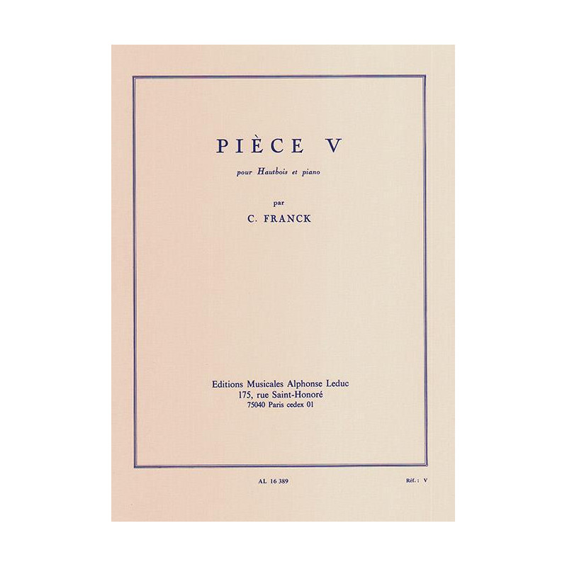 Composé pour hautbois et piano, Piece V de César Franck est une pièce mélodieuse pour des niveaux intermédiaires. La pièce commence par une introduction silencieuse commençant Andantino quasi allegretto. Le thème principal est ensuite joué deux fois avec le piano introduisant chaque phrase suivie par le hautbois en les répétant. La pièce se termine par une très belle harmonie entre le hautbois et le piano. Il n'y a pas de difficulté majeure dans cette uvre vraiment douce qui plairait au public lors d'un récital. César Franck (1822-1890) était un musicien de renom (orgue et piano), compositeur et professeur né au Royaume-Uni des Pays-Bas (Liège) qui était basé à Paris. Bien qu'il n'ait produit que peu de compositions, certaines de ces pièces étaient très célèbres telles que 'Symphony in D minor' et 'Prelude, Chorale and Fugue'