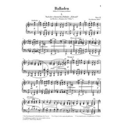 La Ballade écossaise «Edward», tirée du recueil de chants populaires «Stimmen der Völker in Liedern» de J. G. Herder (Voix des peuples), impressionna à tel point Brahms que, comme il le dit à un ami, les mélodies sarrangèrent delles-mêmes en lui. «Edward» fournit le motif de la première des quatre ballades, contes musicaux de nature romantique et dramatique, liés pour Brahms à des souvenirs communs avec Clara Schumann. Pour Julius Grimm, à qui les pièces sont dédiées, «cest à elle quappartiennent en fait les ballades». Robert Schumann quant à lui sexprima avec enthousiasme sur luvre de son jeune collègue. Cest le grand pianiste Lars Vogt qui a apporté les doigtés à notre édition Urtext de cette oeuvre facile à jouer. Celle-ci offre le texte fondé à partir du volume musicologique à paraître prochainement de lEdition Complète des uvres de Brahms.