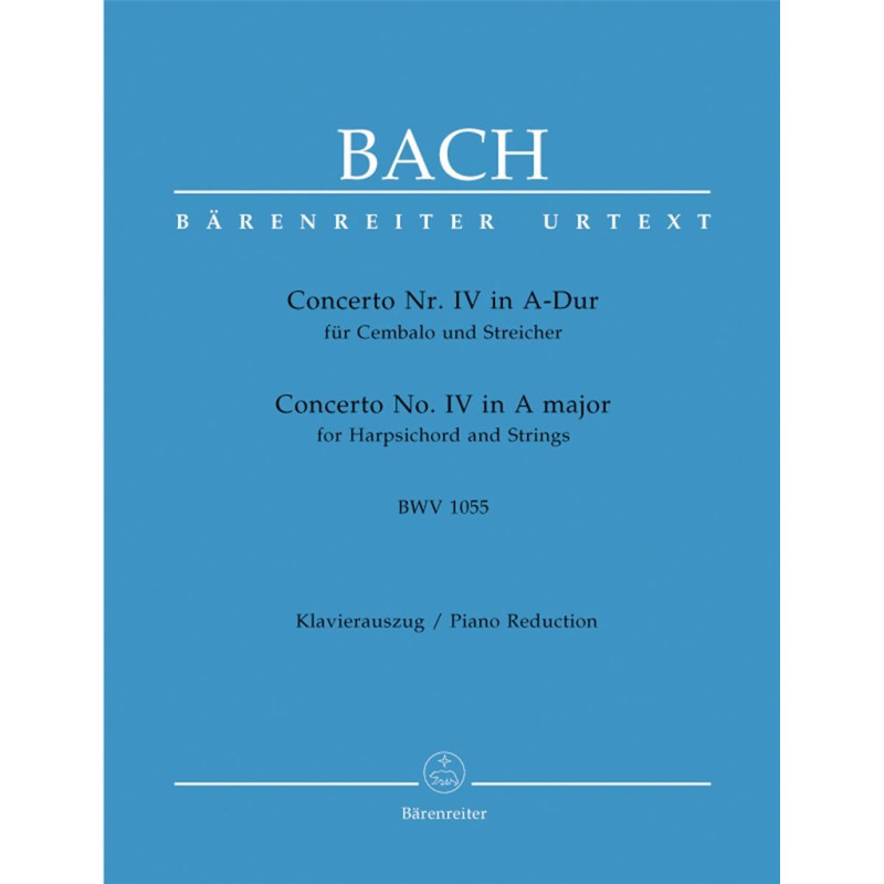 - Partitions complètes et matériel d'interprétation pour les cinq concertos pour clavecin et cordes, BWV 1052-1056 (BA5224-BA5228), le concerto pour clavecin, deux flûtes à bec et cordes BWV 1057 (BA5229), ainsi que le concerto BWV 1058 (BA5230) également forHarpsichordand Strings basé sur le Concerto pour violon en la mineur sont disponibles à la vente.