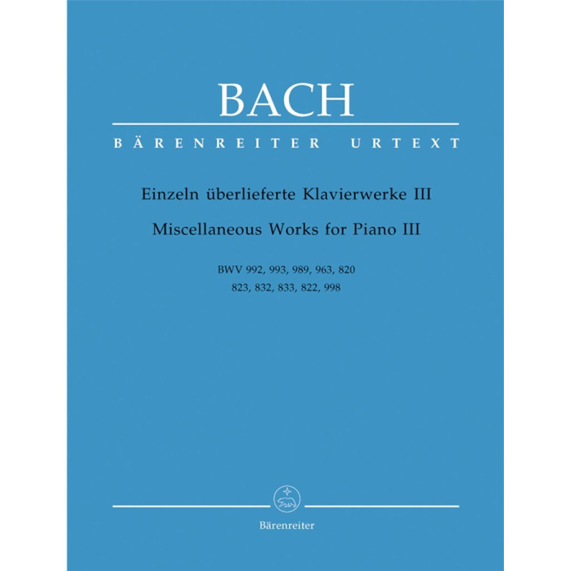 Un troisième volume d'oeuvres diverses de JS Bach. Comprend : BWV 992, 993, 989, 963, 820, 823, 832, 833, 822, 998. Cette édition Barenreiter faisant autorité par Hartwig Eichberg et Thomas Kohlhase.