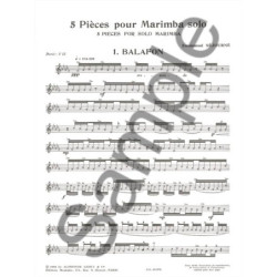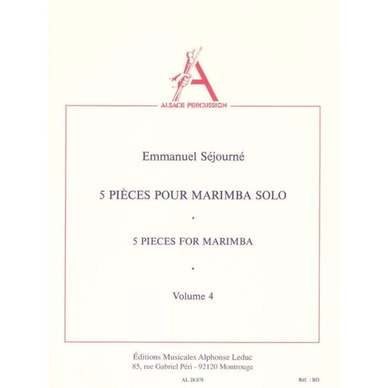 Le quatrième volume d'une série de livres pour percussionnistes d'Emmanuel Séjourné, 5 pièces pour Marimba, Vol.4 est un ensemble de 5 uvres pour 4 à 4,5 Marimbas. Écrites pour des musiciens de niveau avancé et inspirées des rythmes africains, les trois premières compositions peuvent être jouées les unes à la suite des autres ou séparément. Les cinq pièces sont : Balafon Ambira Akadinda Generalife Pretexte Les noms de ces 5 pièces pour Marimba, Vol.4 ont été donnés d'après différents instruments africains à lames de bois que l'on peut trouver à divers endroits. Alors que Pretexte est plutôt jazzy avec son rythme fort, Generalife est plus dynamique et devrait être joué avec plus d'énergie et de caractère. Emmanuel Séjourné (né en 1961) est un percussionniste et compositeur français fortement influencé par la musique occidentale et la musique populaire. Il a écrit une série de livres pour percussionnistes, dont « Keyboard and Percussions, Vol. 1'.