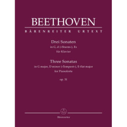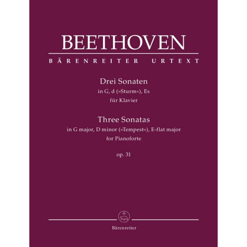 Avec ses sonates op. 31 composées en 1802 par Beethoven regroupaient pour la dernière fois les sonates pour piano sous un seul numéro d'opus. La pièce maîtresse du recueil est sans doute la dramatique Sonate en ré mineur surnommée « Tempête » qui fascinait déjà ses contemporains. Selon Anton Schindler, qui a interrogé le compositeur sur la « clé » de cette uvre ainsi que de la sonate op. 57 (« Appassionata »), Beethoven lui conseilla : « Lisez simplement la Tempête de Shakespeare ». Jonathan Del Mar, actuellement l'un des érudits les plus renommés de Beethoven, propose une édition Urtext méticuleusement éditée sur la base d'une étude intensive de toutes les sources. Les interprètes se voient présenter un texte musical proposant des lectures inédites et basées sur les dernières découvertes de la recherche. Le commentaire critique détaillé rend compte des sources, des lectures et des corrections éditoriales. Dans cette édition, un grand soin a été apporté à une mise en page conviviale qui d'une part reflète le flux et le tempo de la musique et d'autre part facilite l'étude de cette musique complexe au moyen d'une apparence transparente et claire sur la page comme ainsi que de bonnes pages qui se tournent. Le chapitre sur la pratique de l'interprétation d'époque est particulièrement éclairant, car il met en lumière certains problèmes liés aux instruments de Beethoven et à leur tessiture, à l'utilisation des pédales, au tempo, à la dynamique, à l'articulation et aux ornements.