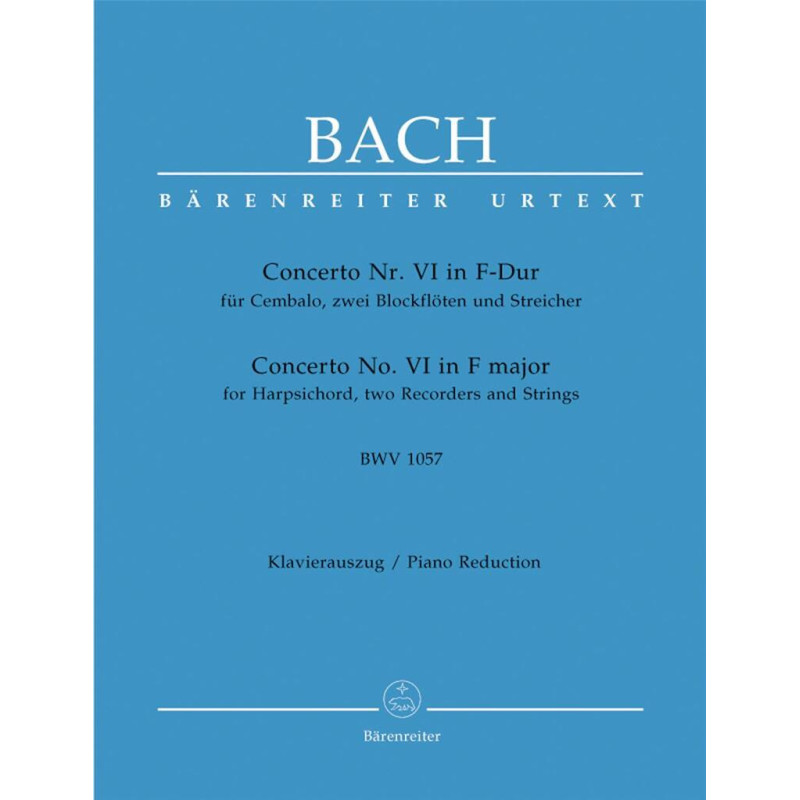 Le Concerto en fa majeur, BWV 1052 est le sixième des concertos pour clavecin contenus dans la partition autographe que Bach a écrite vers 1738 (Berlin Staatsbibliothek, Mus. ms. Bach P 234). Les initiales à la fin de la pièce, SDGl (« Soli Deo Gloria »), forment un pendentif au JJ (« Jesus Juva ») trouvé à l'ouverture du Concerto en ré mineur, BWV 1052. Cela indique que BVW 1057 formait la finale. pièce de cet opus de six uvres, le seul recueil authentique et autonome de concertos que nous ayons de Bach en dehors de sa copie de présentation des Concertos brandebourgeois (1721). Comme tous les autres concertos de cette série, le BWV 1057 est un arrangement d'une uvre antérieure, en l'occurrence le Quatrième Concerto brandebourgeois en sol majeur (BWV 1049).