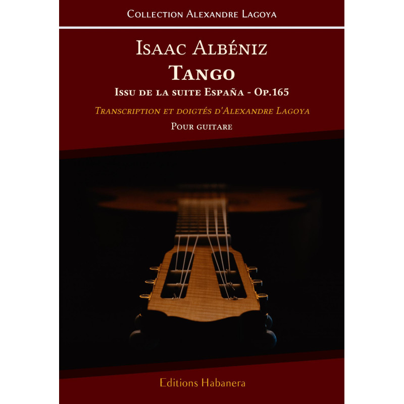 Tango, op. 165, n°2 en Ré majeur dIsaac Albéniz fait partie de la suite España pour piano composée en 1893. Dans sa transcription, Alexandre Lagoya a tout dabord opté pour un changement de tonalité en adaptant loeuvre en La majeur. Cette tonalité convenant bien à la guitare rend la pièce plus brillante sur linstrument que le Ré majeur initial. Ensuite, si vous comparez cette transcription avec la partition pour piano, vous constaterez quAlexandre Lagoya a choisi dans son écriture de constamment respecter la richesse harmonique et mélodique de luvre originale. Enfin, pour pallier à la difficulté technique que ces deux choix pourraient apporter, il a soigneusement inscrit des indications pour les deux mains, solutionnant ainsi toute impossibilité.