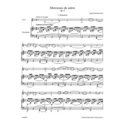 La musique de chambre pour violon et piano comprend les « Morceaux de salon » op. 6 (comprenant une « Romance » et une « Danse hongroise »), une « Romance » en la mineur publiée à titre posthume, et l'arrangement par Rachmaninov du « Hopak » de Modeste Moussorgski, final de son opéra inachevé « La Foire de Sorochyntsi ». Ces uvres furent composées dans le cadre de son amitié, voire de sa collaboration, avec des violonistes tels que Julius Conus (1869-1942) et probablement Fritz Kreisler (1875-1962).