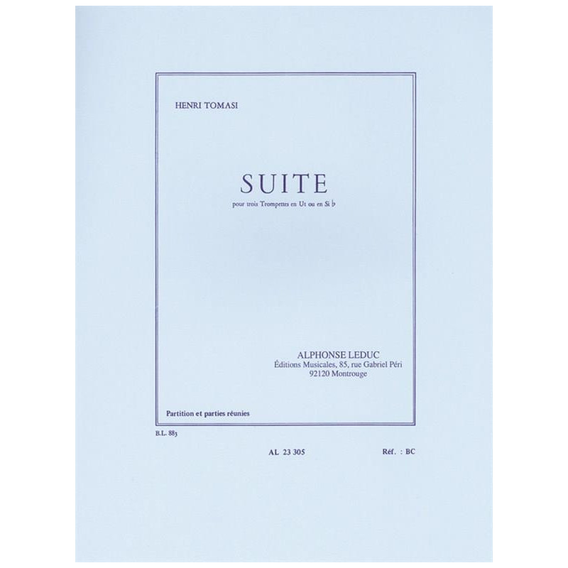 Suite est une pièce pour trois trompettes en Sib ou en Do composée par Henri Tomasi en 1964. Cette suite insolite dure environ 8_x005F_x001A_30 minutes. Il est divisé en trois parties principales : 1. Havanaise at a Tempo di Habanera, 2. Lento égéen et 3. Danse Bolivienne. La Havanaise est composée d'une partie dansée et d'une partie plus mélodieuse. Son dialogue entre les Trompettes crée un contrepoint. Dans la deuxième partie, les trois instruments alternent le thème avec de petites variations et la dernière partie, _x005F_x001A_3. Danse Bolivienne_x005F_x001A_, est une toccata. Ce livre contient des partitions et des parties pour les trompettes en si bémol et en ut. Henri Tomasi était un compositeur, chef d'orchestre français et lauréat du Grand Prix de Rome en 1927. Il a également composé une variété de concertos pour saxophone alto et pour trombone, ainsi que quelques ballades.